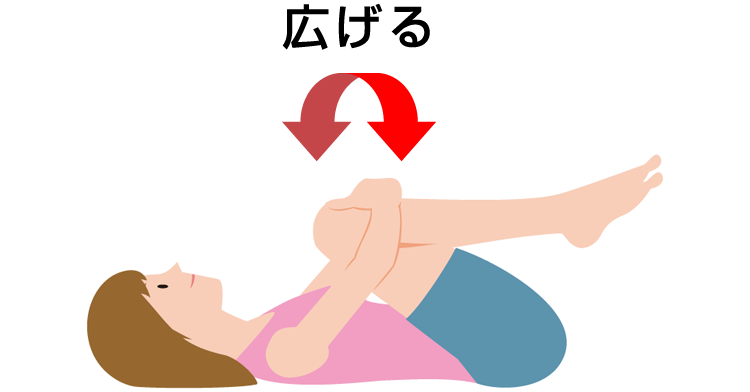 できるだけ股を広げ、ひざを手前にひき寄せ、両手で両ひざをかかえます。頭や肩は床についたままで行ってください。