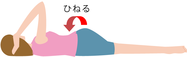 両手をほほに付け、あおむけに寝た姿勢から、上体はそのままで片足をもう一方の足の上にクロスします。クロスさせた足はベッドやフトンの外にたらして、このときに腰をひねります。この運動を左右くり返しましょう。とくに痛い側を念入りに行ってください。