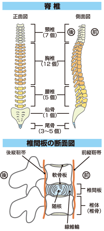 仕組みを見ていくと、一番上にあり、重い頭を支える役目を果たしているのが頸椎です。頸椎の下に胸椎、その下に腰椎と続いていますが、腰椎は仙骨(骨盤)の上に乗っています。これらはそれぞれ、7個、12個、5個の椎骨からなっていて、あいだにクッションのような働きをする軟骨性の椎間板を挟んで、椎骨というブロックを積み重ねた構造になっています。椎間板があるおかげで、ある程度伸縮性があって曲げたり伸ばしたりの脊柱の動きができ、脊柱にかかる衝撃を吸収し、和らげるという役目も果たしてくれているのです。
