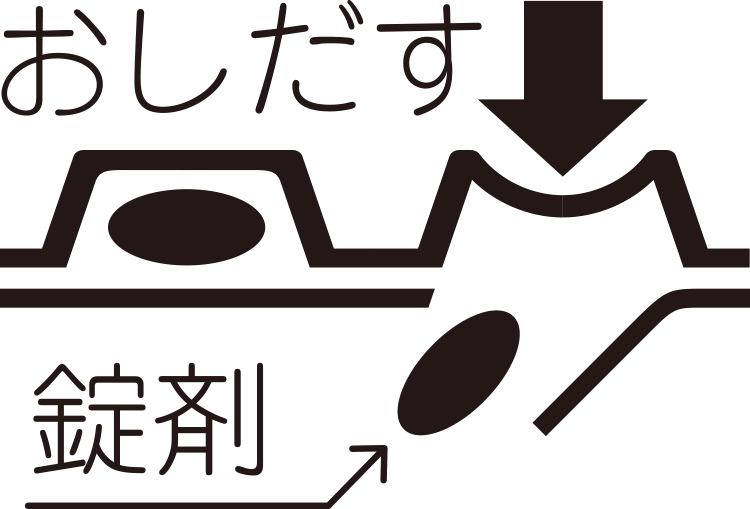 図のように錠剤の入っているPTPシートの凸部を指先で強く押して、裏面のアルミ箔を破り、取り出して服用すること(誤ってそのまま飲み込んだりすると食道粘膜に突き刺さる等思わぬ事故につながる)。