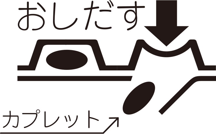 図のように、カプレットの入っているPTPシートの凸部を指先で強く押して、裏面のアルミ箔を破り、取り出して服用すること。(誤ってそのままのみこんだりすると食道粘膜に突き刺さる等思わぬ事故につながる。)