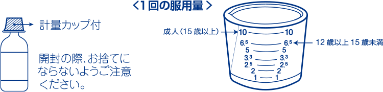 | 成人(15歳以上) | 10mL | 3 回 | 症状により約4時間の間隔をおいて1日6回まで服用することができます。 |