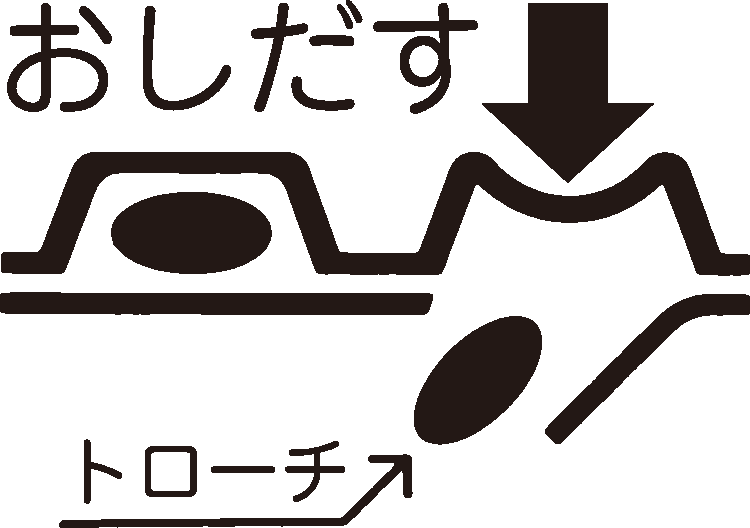 図のようにトローチの入っているPTPシートの凸部を指先で強く押して、裏面のアルミ箔を破り、取り出して服用すること。(誤ってそのままのみこんだりすると食道粘膜に突き刺さる等思わぬ事故につながる。)