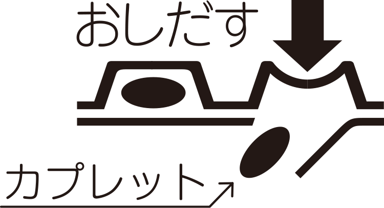 図のようにカプレットの入っているPTPシートの凸部を指先で強く押して、裏面のアルミ箔を破り、取り出して服用すること(誤ってそのままのみこんだりすると食道粘膜に突き刺さる等思わぬ事故につながる)。