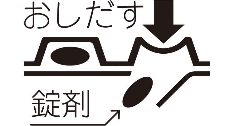 図のように錠剤の入っているPTPシートの凸部を指先で強く押して、裏面のアルミ箔を破り、取り出して服用すること(誤ってそのままのみこんだりすると食道粘膜に突き刺さる等思わぬ事故につながる)。