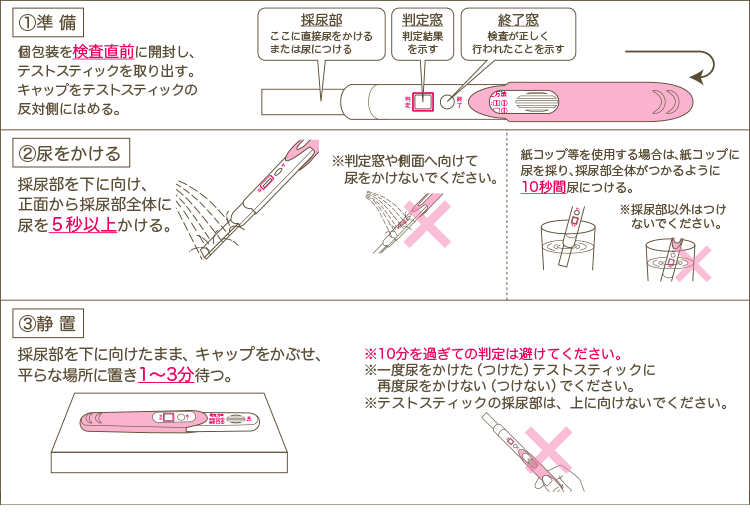 生理予定日の約1週間後から検査できます。朝・昼・夜いつの尿でも検査できます。