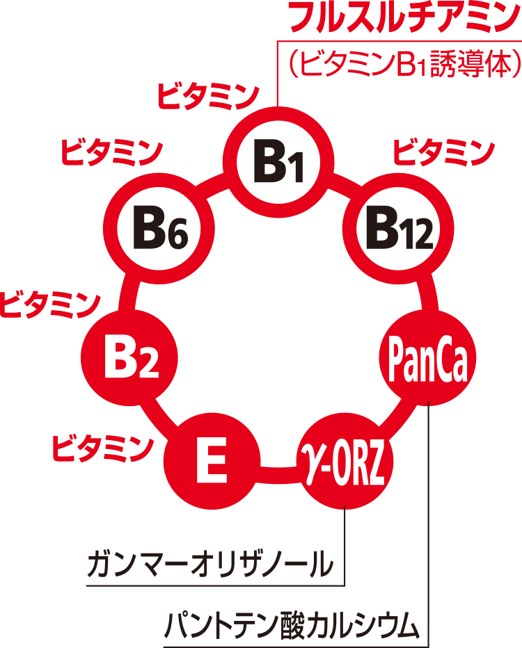 吸収にすぐれたフルスルチアミン(ビタミンB1誘導体)とピリドキシン塩酸塩(ビタミンB6)、シアノコバラミン(ビタミンB12)などを配合し、「目の疲れ」「肩こり」「腰の痛み」などのつらい症状にすぐれた効果をあらわします。