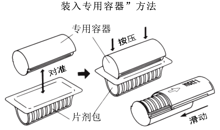 滑动专用容器的盖子将其拆下,将专用容器的主体上下颠倒,放置在片剂包的铝片上,用手指按压,刺破铝片插入其中。然后,直接翻转过来,除去位于上方的片剂包的外壳,自上滑动专用容器的盖子将其嵌入到专用容器中并盖紧盖子。調布 パチスロ时,沿盖子上的箭头所示方向轻轻滑动到底,一片片地取出。