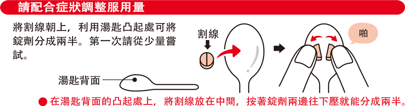 錠劑上帶有割線,可以根據排便情況,按照半錠或者1錠的劑量增加(直至達到上述最大劑量)或者減少。