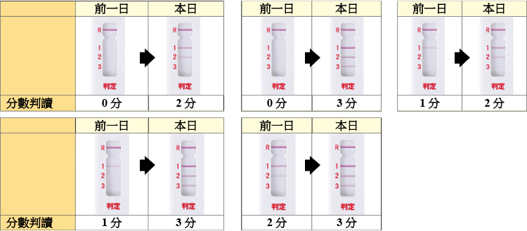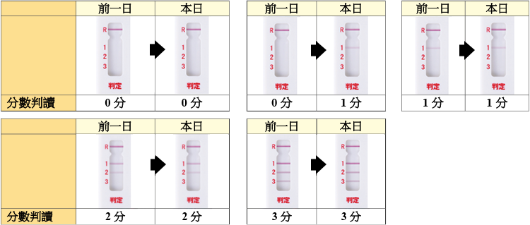 如果已經執行正常的操作,在對照部分將會出現紅紫色的線條。依照判讀部分線條的數量(0~3條),各以0分、1分、2分、3分來判讀。