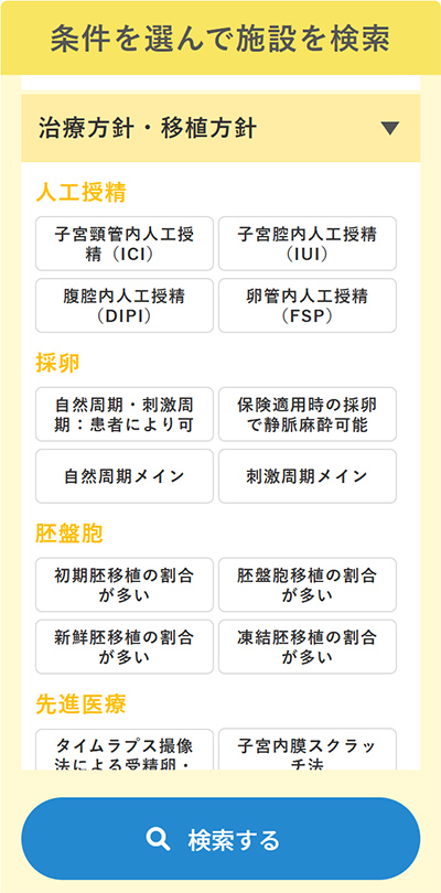 東尾もう一つ力を入れているのが「施設検索」です。現在、全国約650軒の不妊治療施設が登録されており、一般的な情報にとどまらず、他ではあまり見られない専門性の高い検査や治療内容まで幅広く検索できる点が大きな特徴です。 施設には毎年アンケートをお願いし、情報は継続的に更新しています。すべての施設から十分な回答が得られるわけではありませんが、中には細かな項目まですべて答えてくださる施設もあります。そうした詳細な情報がそろうと、患者さんも治療のイメージをより具体的に描けるようになり、「ここなら自分に合いそうだ」と、安心して施設を選ぶことができます。