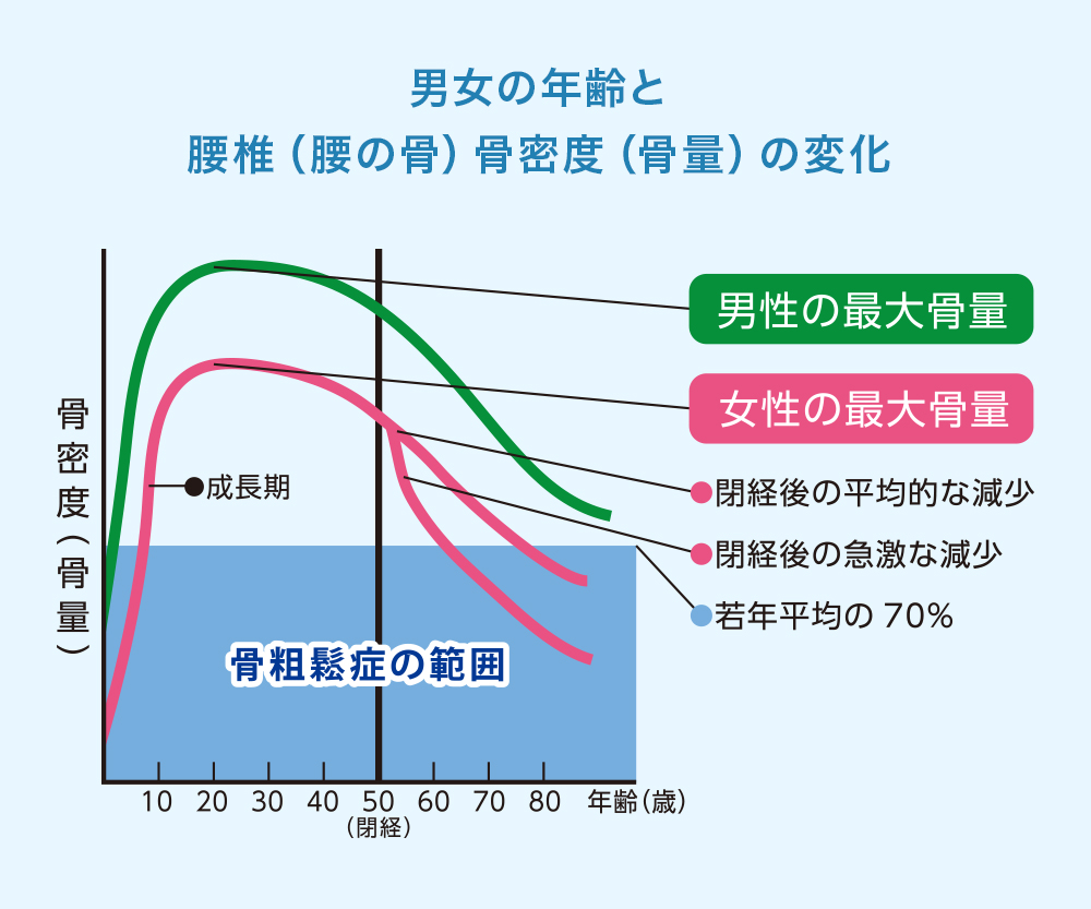 年齢が高くなると骨粗鬆症が増えてきます。特に女性の場合は閉経とともに女性ホルモンが急激に低下するために、骨量が急激に減り、骨粗鬆症になりやすいといわれます。男性にはそのような急激な性ホルモンの低下による骨量の低下はないのですが、腎臓や腸の病気、胃の手術をしたことがある方では骨量も低下しやすくなっています。