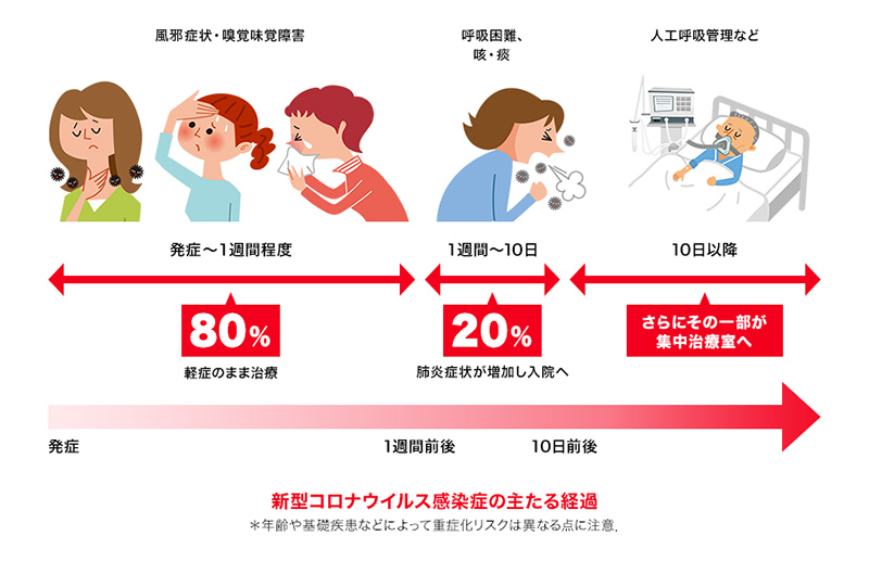 - ※3 重症化例では数週間に達することもある。また、治療や療養が終わっても一部の症状が長引く人がいることがわかってきている。