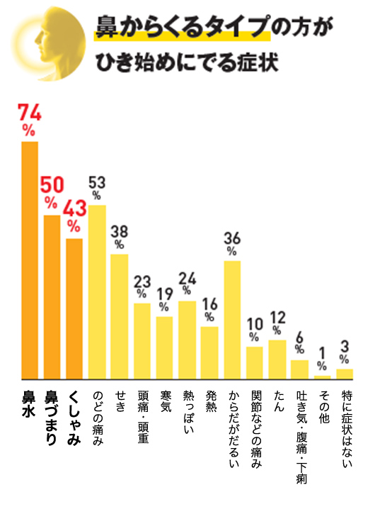 例えば「鼻からくるタイプ」は鼻水やくしゃみなどの症状が中心だと感じていたり、「のどの痛み」についてはどのタイプでも自覚症状として認識する方が多く、各タイプ共通の症状として見られるようです。