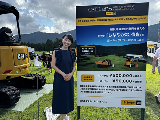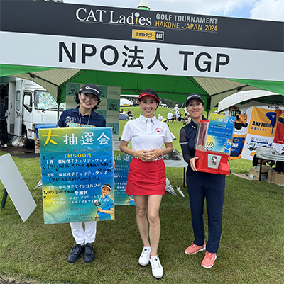 東尾はい、私はプロゴルファーとしての社会貢献の形を模索していて、ナプキン配布の活動をしながら、何かできることはないかと考えていました。アメリカのゴルフトーナメントは地域社会や慈善活動に積極的に貢献しています。日本で行われるトーナメントにも、もう少し社会性を持たせられたらよいのではという思いが元々ありました。「CAT Ladies 2024」内でNPO法人TGPのチャリティテントを設置させていただき、私物のゴルフグッズやトーナメントに参加する選手のサイン入りボールなどが当たるチャリティくじを販売しました。