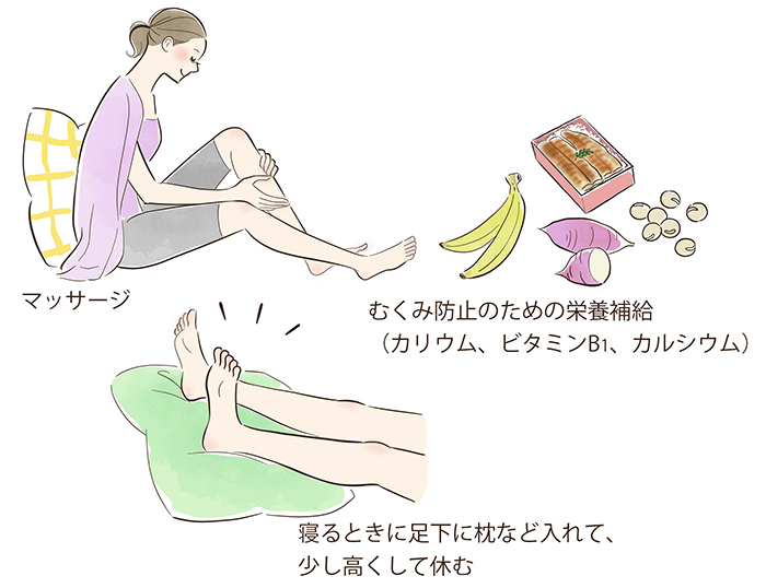 下半身の血液を心臓に戻すような工夫をしてみると良いでしょう。また、むくみが出ると水分を控えたくなりますが、逆に血液循環が悪くなってしまうので、注意してください。 ・水分をしっかり摂る ・寝るときに足元に枕など入れて、少し高くして休む ・着圧式のソックスやストッキングを履く ・十分な睡眠時間を取る ・リンパマッサージ ・ウォーキング ・足浴