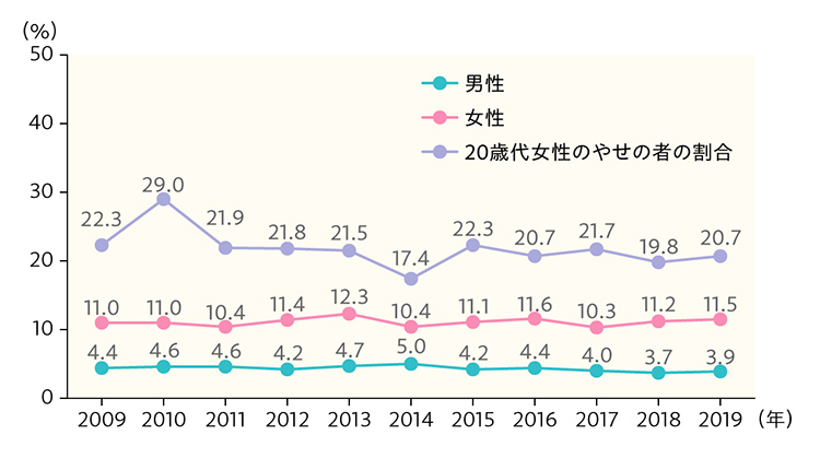 図2 やせの者(BMI<18.5kg/m2)の割合の年次推移(20歳以上)(2009~2019年)