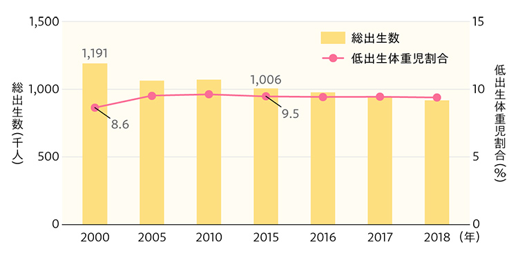 図3 出生数と低出生体重児割合の推移(2000~2018年)