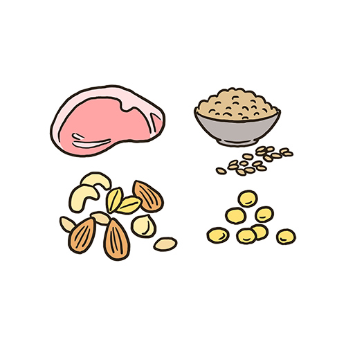 たんぱく質を含む食品というと、主菜である魚や肉、卵、大豆などが思い浮かぶかもしれませんが、穀物にも含まれています。穀物由来のたんぱく質摂取量は全体のたんぱく質摂取量の2割を占めるため、穀物もしっかり摂るようにしましょう。また、魚、肉、大豆では含まれる栄養素が異なるため、特定の食材に偏らず、さまざまな組み合わせで摂取するのがポイントです。