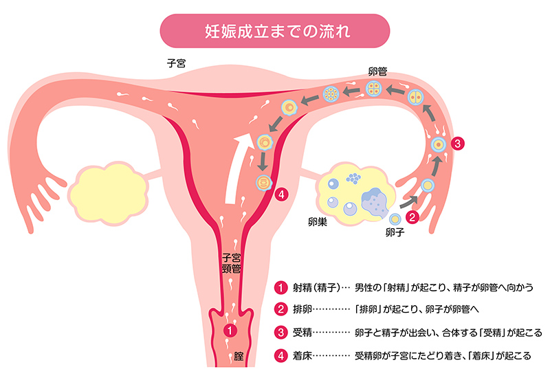男性の「射精」が起こり、精子が卵管へ向かう……➀