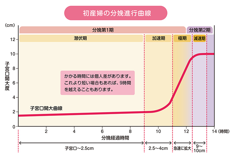 赤ちゃんを子宮から産道(腟)へと送り出すときに起こる子宮の収縮で、少しずつ強くなる規則的な痛みとして感じられます。一般的には10分間隔で規則的な痛みがあらわれると、陣痛が始まったサインとされています※6。 その後、間隔が短くなり、痛みが強くなるにつれ、子宮の出口である「子宮口」は少しずつ開いていきます。子宮口が全開(約10cm)になると赤ちゃんの頭が下がり、いよいよ赤ちゃんが子宮から出て産道へ進みます。 近年は、無痛分娩の実施が増えています。麻酔(主に硬膜外麻酔)を使って出産時の陣痛の痛みを和らげる分娩で、完全に痛みがなくなるわけではなく、意識は保ちつつ、お腹の張りやいきむ感覚は残すことで、お母さんの心身の負担を軽減することが目的です。選択肢の一つとして増えている一方で、無痛分娩の安全な実施が一層求められています。 陣痛が始まってから赤ちゃんが生まれるまでの時間は、初めての出産だとだいたい12〜18時間、2回目以降の出産だと6〜8時間くらいです※7。
