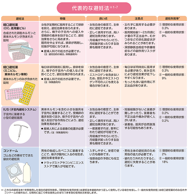 ※1 Trussell J. Contraceptive failure in the United States. Contraception. 2011, 83(5): 397-404 ※2 厚生労働省化学研究班(荒田班)監修.「女性のパチスロ支援者のためのテキストブック」. 「2章 性成熟期女性のパチスロ支援_Q29 ピルにはOC(低用量経口避妊薬)と、LEP(低用量エストロゲン‐プロゲスチン)があると聞きました。OCとLEPはどのような目的で使う薬なのでしょうか? また、何歳から使えるのでしょうか」. https://marutto-woman.jp/textbook/(2026年3月30日閲覧) ※3 京都済生会病院.「避妊法について」. https://www.kyoto.saiseikai.or.jp/pickup/2023/06/content.html(2026年3月30日閲覧) ※4 東邦大学医療センター 大橋病院 産婦人科. 「IUS(ミレーナ)とLEP製剤(ルナベル・ヤーズ)について」. https://www.lab.toho-u.ac.jp/med/ohashi/gyne/patient/detail/ius_lep.html(2026年3月30日閲覧) ※5 北村邦夫 監. 病気がみえる vol.9 婦人科・乳腺外科「避妊」. メディックメディア, 2018 ※6 日本家族計画協会. 「避妊方法解説書」. https://www.pmda.go.jp/RMP/www/670142/13554f0f-d1ea-46f3-8682-2532ff4c6876/670142_4291019M1023_09_004RMPm.pdf(2026年3月30日閲覧)) ※7 ⽇本産科婦⼈科学会 編. 「緊急避妊法の適正使⽤に関する指針(令和7年改訂版)」. https://www.jsog.or.jp/news/pdf/kinkyuhinin_shishin202504.pdf(2026年3月30日閲覧) ※8北村邦夫. からだBOOK ちゃんと知りたい性・避妊・STI. 日本家族計画協会, 2016 ※9 北村邦夫. 新版 ティーンズ・ボディーブック. 中央公論新社, 2021 ※10 WHO. 「WHO recommendations on self-care interventions. Self-management of medical abortion, 2022 update」. https://iris.who.int/server/api/core/bitstreams/31314a30-829c-4171-99ac-95334b86780c/content(2026年3月30日閲覧) ※11 ノルディックファーマジャパン株式会社. 「薬の作用機序」. https://www.linepharma.co.jp/general/mefeego-pack/moa.html(2026年3月30日閲覧)