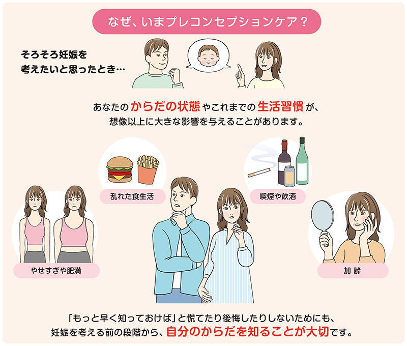 妊娠を望んだとき、これまでの生活習慣やからだの状態が、思いがけない形で影響することがあります。 やせすぎや肥満、喫煙・飲酒や食生活の乱れ、そして年齢の影響――。 「もっと早く知っておけば」と慌てたり後悔したりしないためにも、妊娠を考える前の段階から、自分のからだを知ることがとても大切です。 体質や持病などにより、妊娠が難しい可能性がある場合でも、早い時期から情報を得て対策を考えることで、選べる道は広がるかもしれません。 若い時期は、進学や仕事、キャリア形成など、目の前のことで精一杯になりがちで、妊娠や出産を考えるのは、まだ先だと感じるのも自然なことでしょう。それでも、少しだけ目を向けておくことで、将来の選択を守ることにつながります。妊娠や出産を望まない場合であっても、自分のからだと人生を、他人任せにせず主体的に守り選んでいくうえで、プレコンセプションケアの視点は役立ちます。