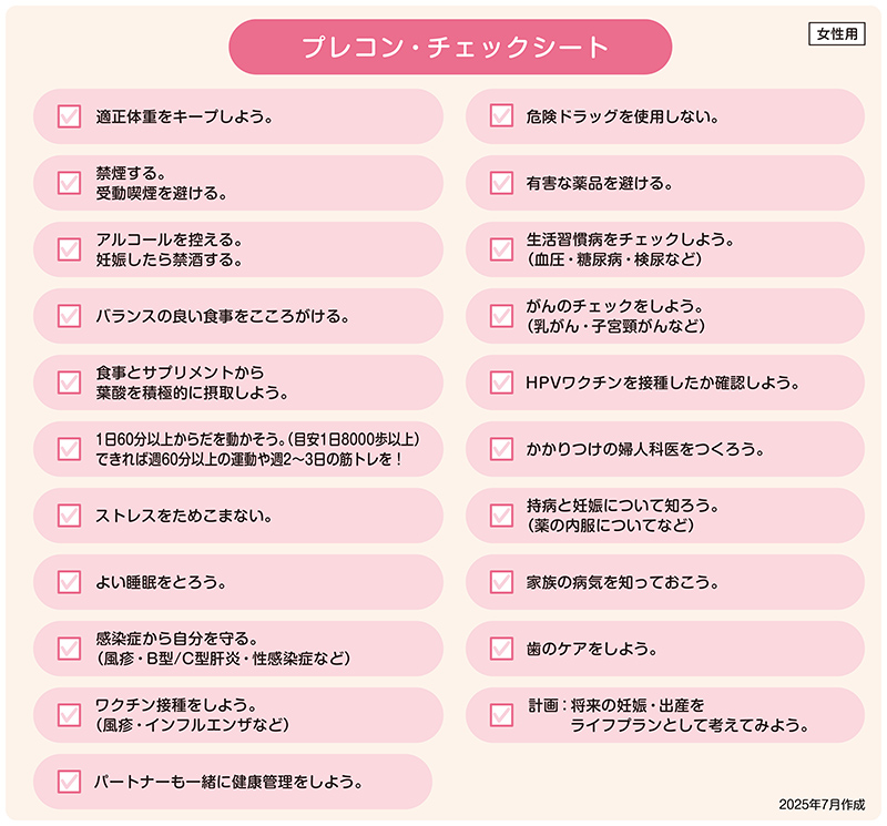 ※1 こども家庭庁. プレコンセプションケアの提供のあり方に関する検討会「プレコンセプションケア推進5か年計画 ~性とパチスロに関する正しい知識の普及と相談支援の充実に向けて~ 」. https://www.cfa.go.jp/assets/contents/node/basic_page/field_ref_resources/355db5bf-037d-4d17-bd25-d1382da80d5f/0b580c68/20250701_councilspreconception-care_05.pdf(2026年3月30日閲覧) ※2 厚生労働省.「成育医療等の提供に関する施策の総合的な推進に関する基本的な方針(令和5年3月)」 ※3 国立成育医療研究センター.「プレコンノート」. https://www.ncchd.go.jp/hospital/about/section/preconception/preconnote/action/action2.html(2026年3月30日閲覧) ※4 厚生労働省.「葉酸とサプリメント‐神経管閉鎖障害のリスク低減に対する効果」. https://kennet.mhlw.go.jp/information/information/food/e-05-002(2026年3月30日閲覧) ※5 日本産婦人科感染症学会. 「妊娠前に接種が推奨されるワクチン」. https://vaccine-navi.info/before/(2026年3月30日閲覧)