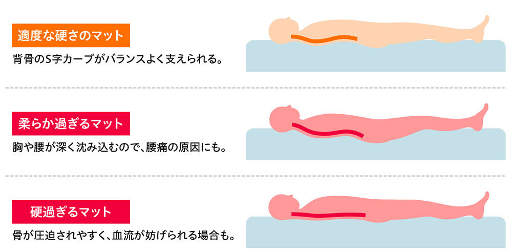 ベッドマットや敷布団の硬さは好みが分かれますが、眠りの質を考えるなら、「背骨のS字カーブ」をバランスよく支えられる適度な硬さで、かつ通気性の良いものがおすすめです。