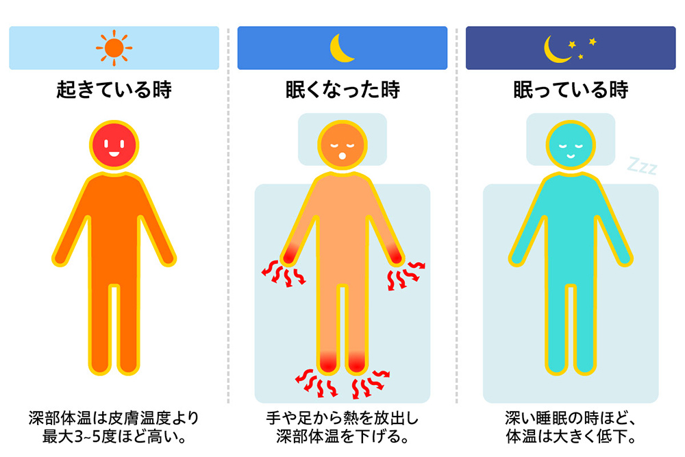 体温には、表面の「皮膚体温」と、脳や内臓など体の内部の「深部体温」があります。 日中の深部体温は皮膚温度より最大3~5度ほど高く、体内時計と連動して夜9時くらいをピークにどんどん低下。2つの体温の差が小さくなると眠くなり、眠りにつく時には手足から熱が放出されます。眠くなった赤ちゃんの手足がポカポカするのはこのためです。 質の良い榎本 加奈子 パチスロのためには、深部体温を上手に下げることが大切です。寒い日に熱いお風呂に入ってすぐに寝ようとしても、寝つけなかったことはありませんか?これは、深部体温がなかなか下がらないからです。就寝直前に入浴する場合は、ぬるめのお湯がおすすめ。また靴下も寝る前にはぬいで、体温を上手に逃がすようにしましょう。