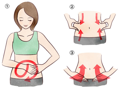 ①腸の内容物が進む方向に合わせて「の」の字にマッサージ ②左右の脇腹を上下に揉む ③下腹部を上に押し上げるように圧迫する などといった方法があります。入浴中に行うと加温効果と相まって有効です。