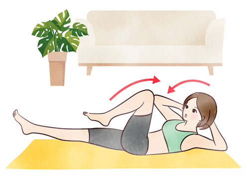 お腹を左右にひねったり伸ばしたりなどする運動は、便を排泄するためのインナーマッスルの腸腰筋(ちょうようきん)を鍛えることにつながると考えられます。3つの筋肉から成る腸腰筋は、腹筋と共に便を体内から押し出すために必要な筋肉です。ひねり運動を取り入れた腸腰筋トレーニングでおすすめなのは「バイシクルクランチ」です。仰向けに寝た状態から上体をやや持ち上げつつ足も浮かせ、自転車を漕ぐように両足を交互に胸へ引き寄せます。両手を首の後ろ側で組み、右肘と左膝、左肘と右膝が接近するように引き寄せながらゆっくりと行うと効果的です。